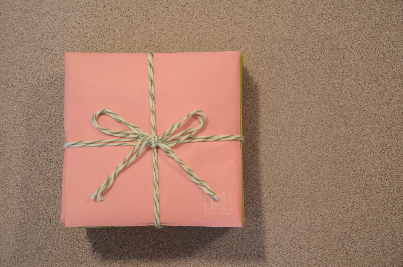 I divided the letters into two stacks, packaged them in pretty square stationary, and tied them up with some striped yarn. I then wrapped them in a box with another card that said “start here” and gave an explanation of the gift.