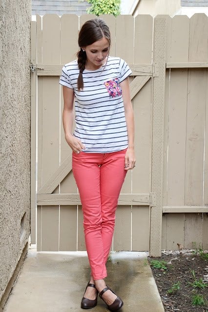 Step 7. Next it’s time for the pocket. Cut a square out of your contrasting fabric and hem on all sides, then pin to your shirt and sew sew around all the sides except the top with a straight stitch.