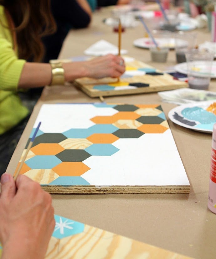 The event was hosted by Andrea from For The Love Of and was held in this darling studio in downtown Fullerton. We got to play around with some new awesome Cricut machines, create some pretty hexagon paintings, eat delicious food (all made by Andrea…seriously, I could have eaten the entire pan of her ricotta, goat cheese, and tomato dip), and just hang out. It was a blast.