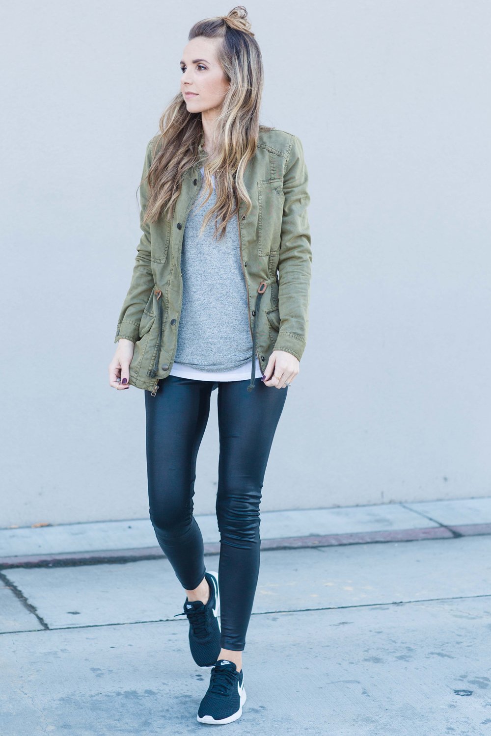 For this athleisure look, I chose neutral layers — an olive jacket, a gray sweater, and a white tee — and then paired them with some faux leather leggings. I wore this to the amusement park last weekend while we had company in town, and it was super comfortable for walking around the park, but made me feel put together. Plus it’s easy to shed layers when the weather changes throughout the afternoon.
