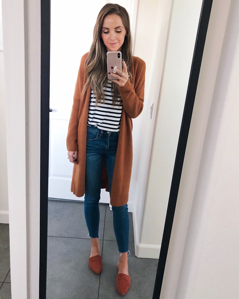 Rust Colored Cardigan, Striped Tee (under $20), Similar Raw Hem Jeans, Studded Mules