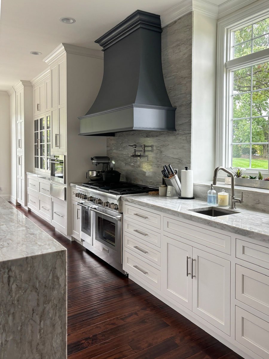 - The oven hood. It was such a gorgeous piece that we wanted to keep it. But it was a dark wood that didn’t work with the aesthetic of the kitchen, and it was distressed wood, which also didn’t match the look. So we filled in the distressing and painted it dark gray, and it turned out so beautifully.