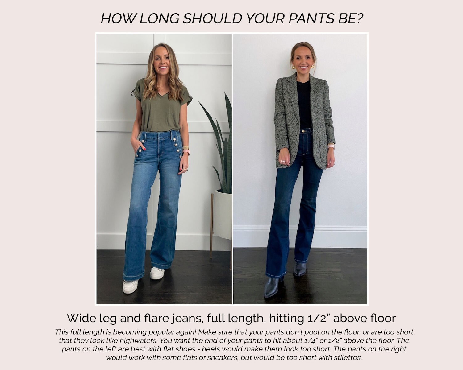 It can be tricky to know which length of pants or jeans is right, especially when flares are coming back into style, cropped jeans are in, and also it’s winter so you want to make sure your ankles are covered.