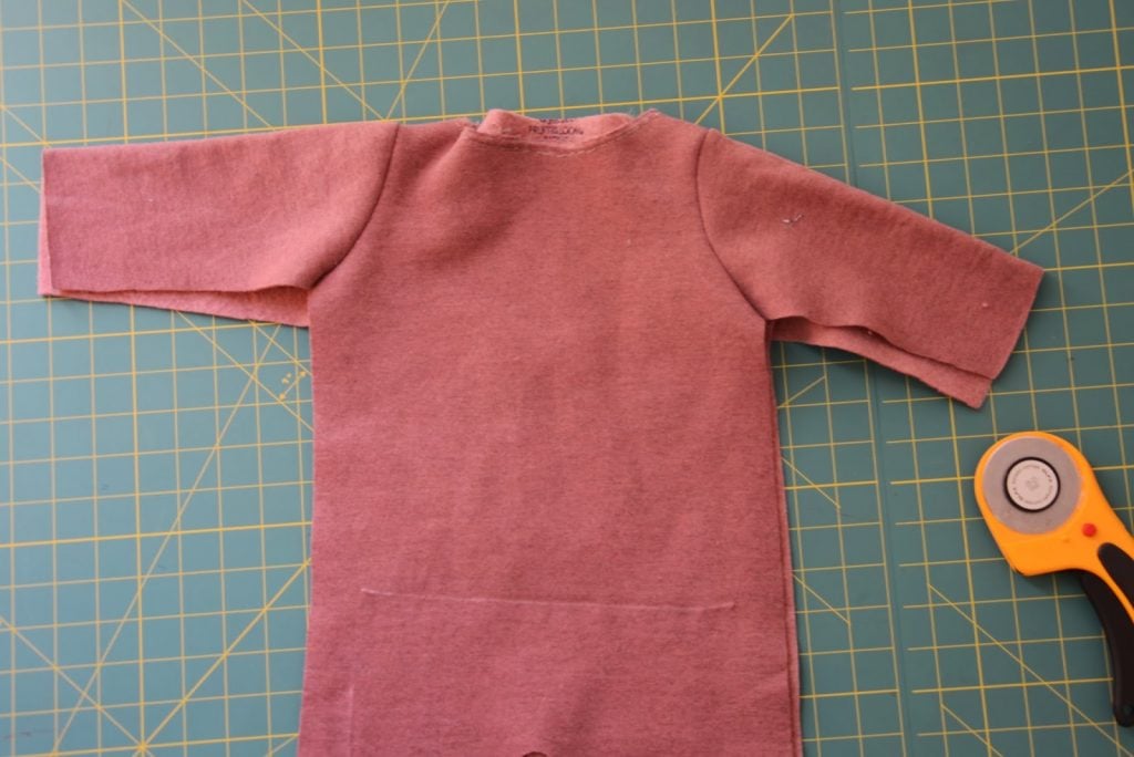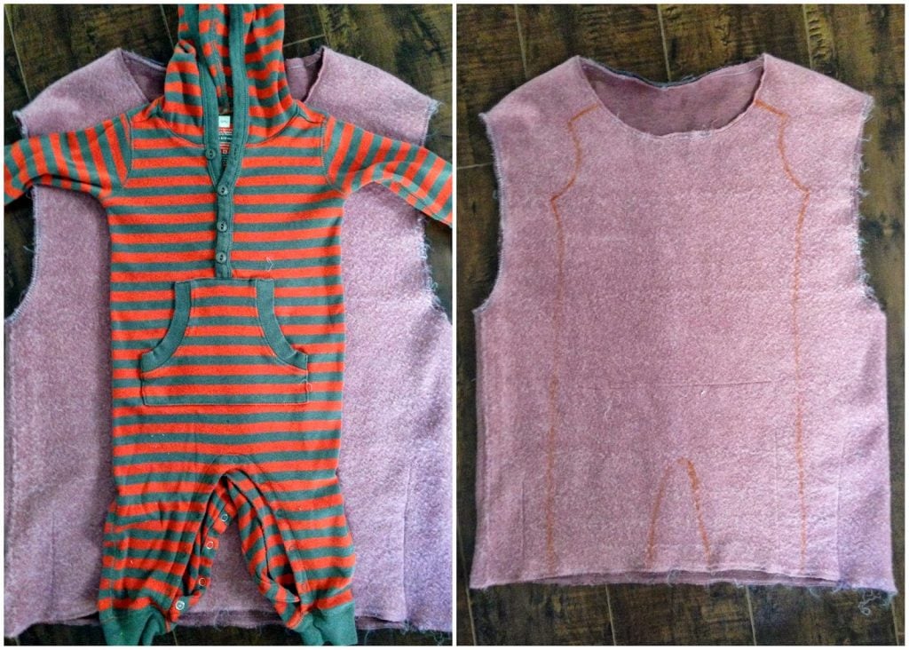Step 3. Using a hoodie that fits your child, trim down the men’s hood, leaving a 1/2″ seam allowance. If you don’t have an existing baby hoodie, just trim down the men’s hood several inches, using the original shape as a guide.