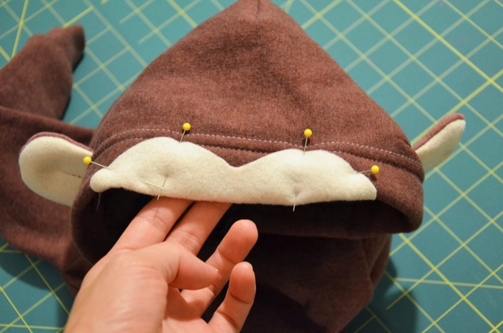 *I originally folded the felt underneath and sewed it in place, but the double thick felt on top of the thick hood made the hood really stiff. Instead, trim off the felt at the edge of the hood (so it doesn’t fold under) and sew in place.