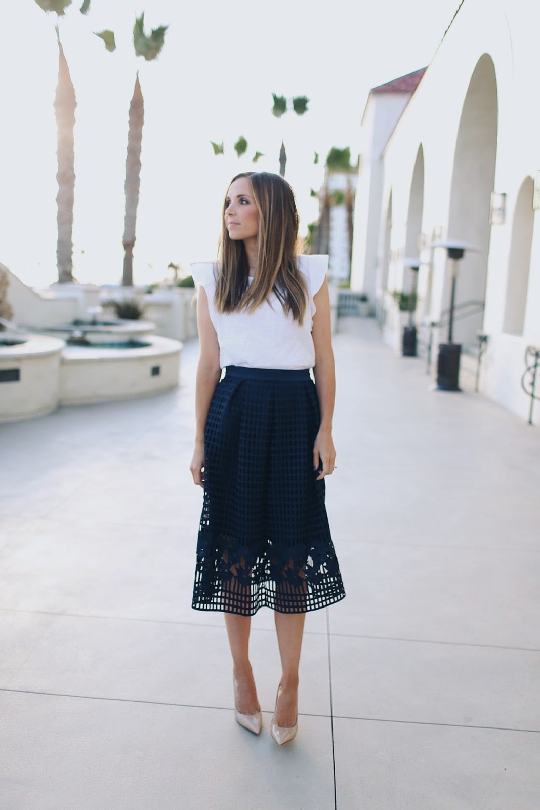 NAVY MESH SKIRT (20% off this weekend with code HISUMMER; wearing size 4) — similar here for under $50! || WHITE RUFFLE SLEEVE TOP (on sale for $18! wearing size small) | HEELS (similar here for under $70) | SIMILAR BAG Wedding season is upon...