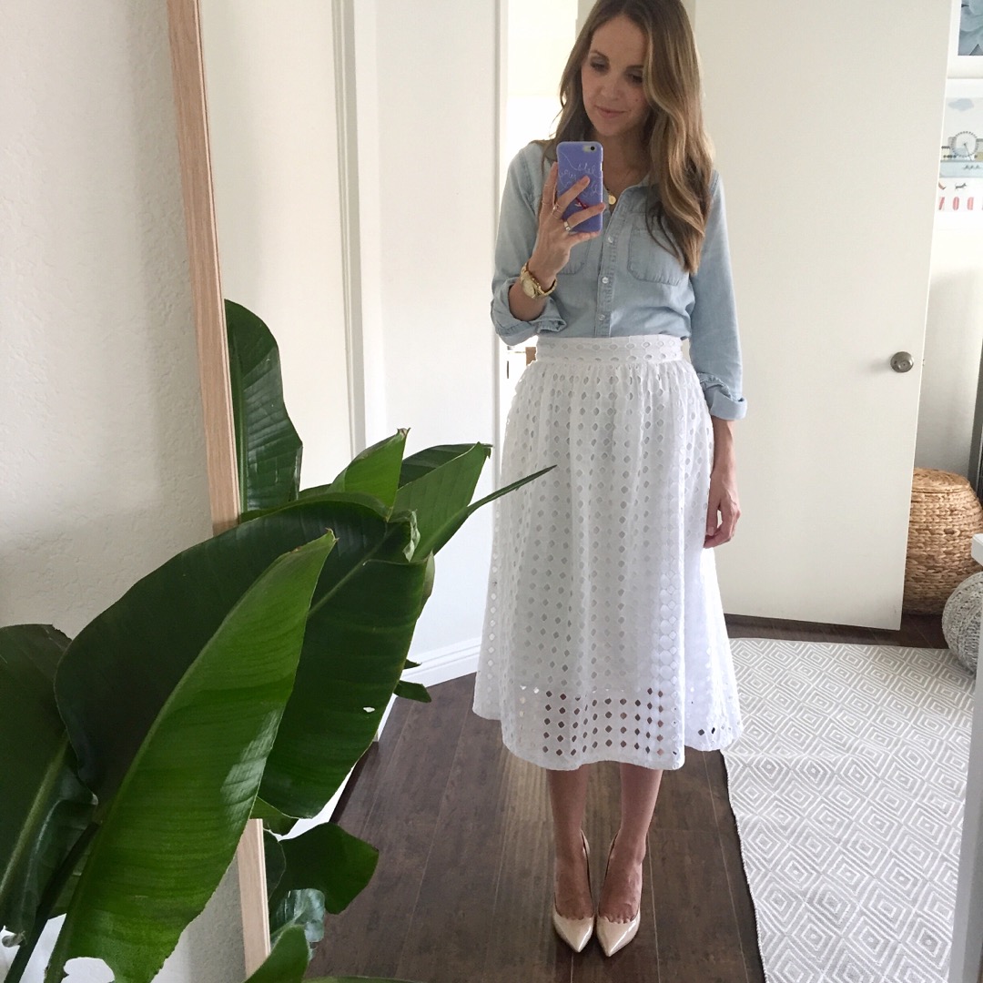 CHAMBRAY TOP || EYELET SKIRT || NUDE PUMPS (less expensive version here and here) || NECKLACE || WATCH I wore this gorgeous eyelet midi skirt to church last week and it’s the perfect piece for spring. Per request, I’ll soon be sharing a few ways to...