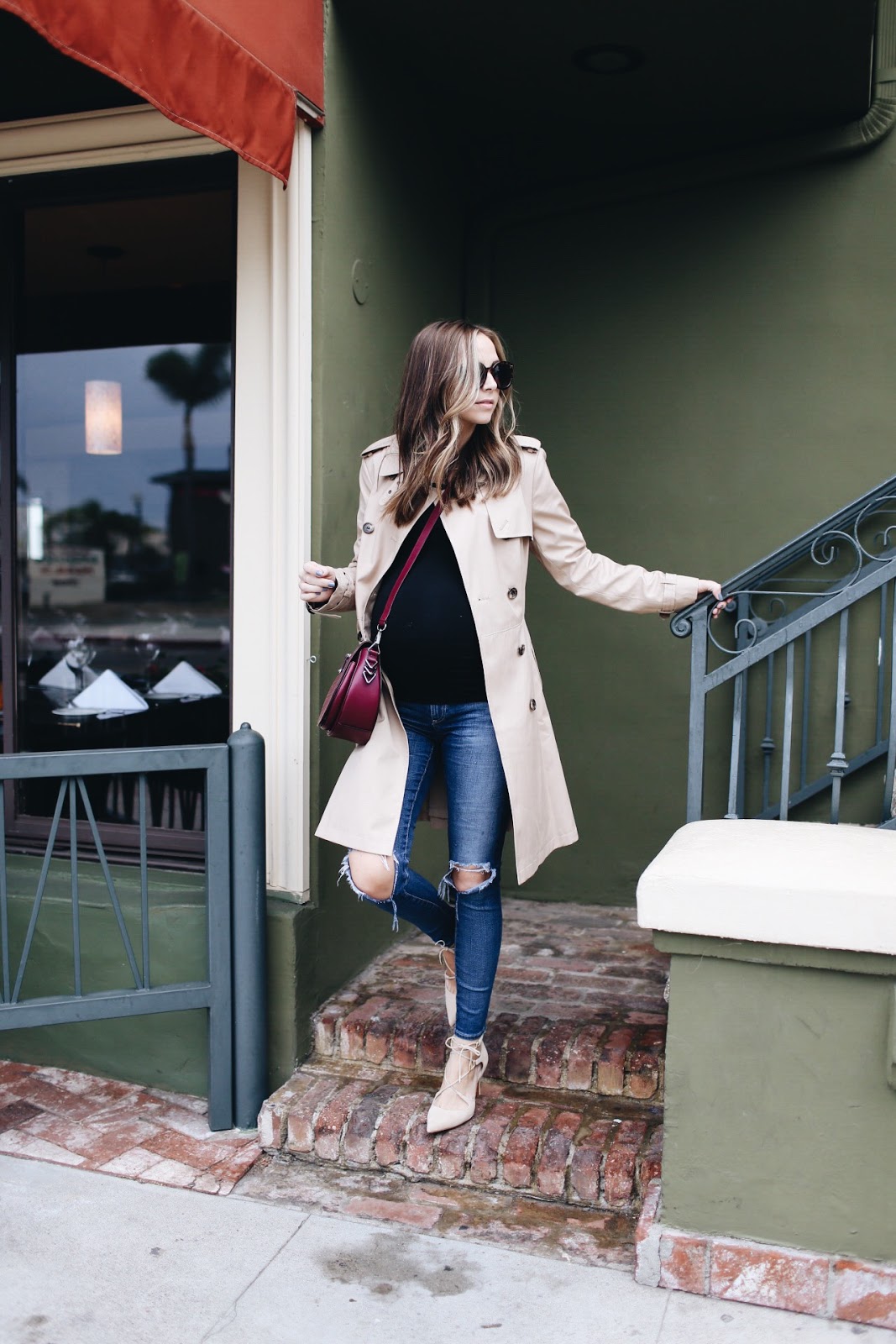 OUTFIT DETAILS: TRENCH COAT | H&M MATERNITY TEE | AG MATERNITY JEANS | LACE UP HEELS | REBECCA MINKOFF CROSSBODY BAG | URBAN OUTFITTER SUNGLASSES Spring weather is always crazy in California — we go from hot to cold back to hot and back to...