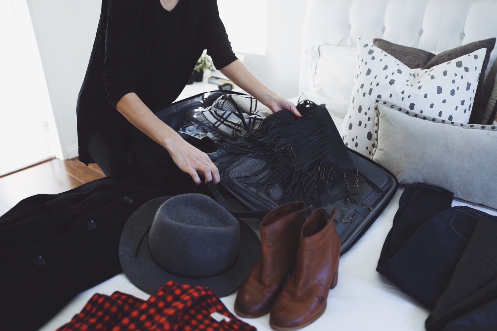 OUTFIT DETAILS: BLACK TUNIC || DSTLD DENIM || MINNETONKA SLIPPERS Traveling for the holidays can be tricky. We did it for so many years, and especially with kids it’s hard to fit everything in plus gifts if you’re bringing those along. So learning to pack...