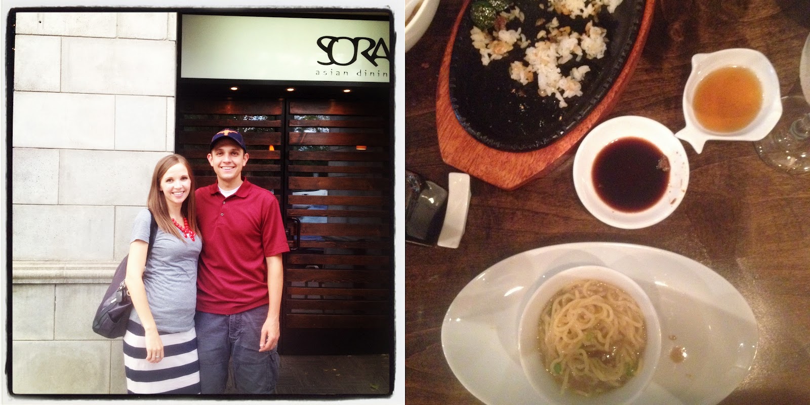 For dinner, we tried out a newish restaurant in Provo called Sora. It’s Japanese food, and although I haven’t had much experience with sushi (and can’t eat anything uncooked right now), I was feeling adventurous and up for something new and fun. It was fantastic. Nice atmosphere, good service, and fantastic food. We opted for family style and tried a few appetizers, two sushi rolls, soup, and a beef and rice dish. All of it was so good — we’ll definitely be back. And next time I’m trying the strawberry shrimp sushi roll that the waitress kept raving about. Oh, and my little brother was staying with us for the weekend, so he joined us, and despite dropping every piece of his food in the super spicy chili sauce on accident, he seemed to have a good time too 🙂