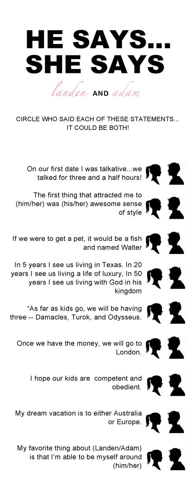 Once everyone had eaten, we played a quick game. I’m not a fan of most shower games (baby or bridal), but I found this cute one via pinterest and it was quick, cute, and everyone seemed to enjoy it. Plus, it wasn’t one bit embarrassing to the bride, and didn’t involve chewing 20 pieces of bubble gum (my jaw aches as I type that sentence).