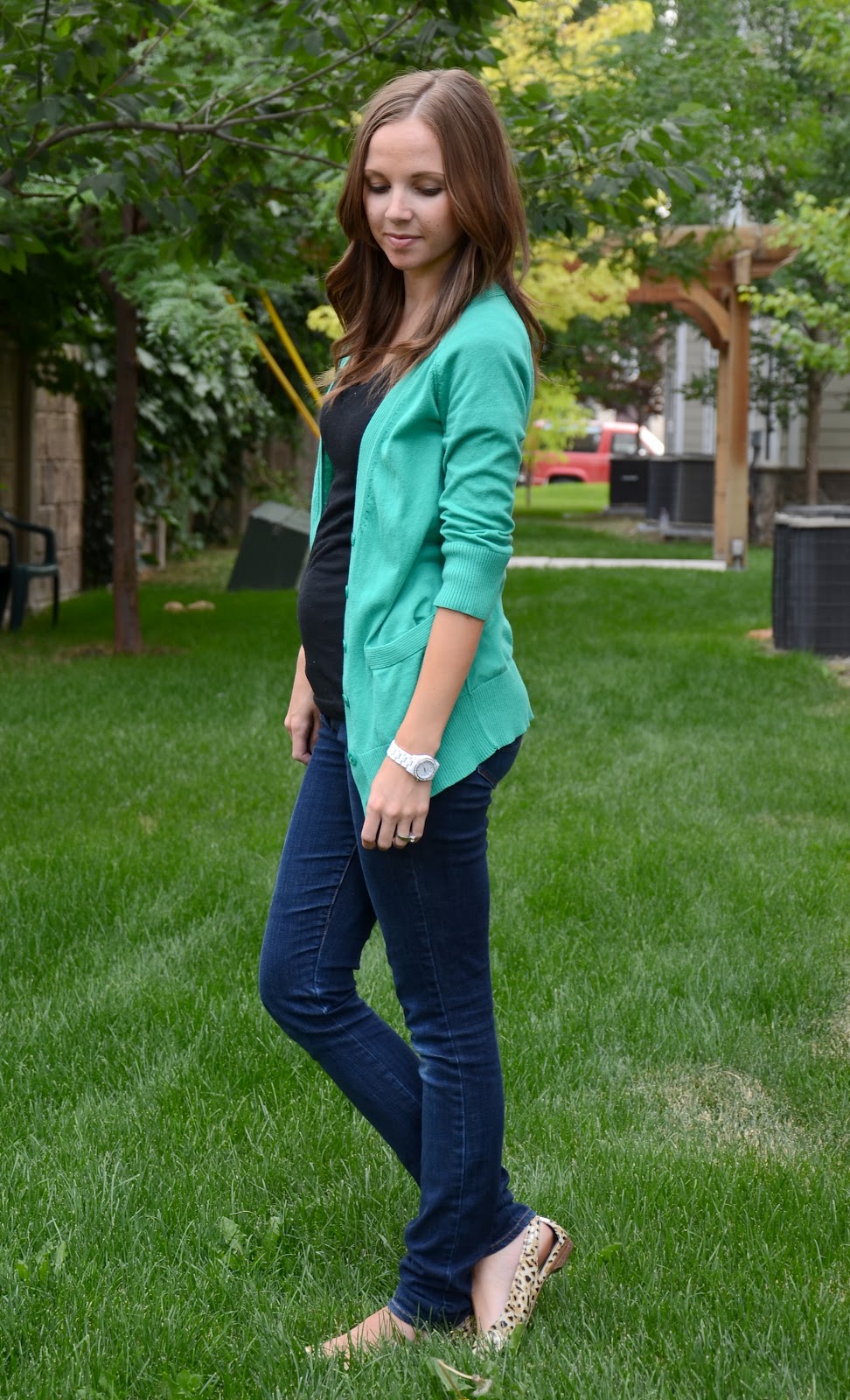 You are so cute pregnant! And I totally know what you mean about not being too motivated to get out of the tees and stretchy pants these days. Sometimes I just feel ugly or uncomfortable in whatever I'm wearing so what's the point?! Hahahaha! I'm loving that teal cardigan! Thanks for participating!