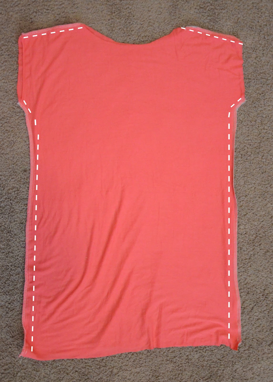 Step 2. Cut out the neckline with your desired measurements. I wanted a boatneck, so mine was about 9″ wide and 2 1/2″ deep. Once your neckline is cut, slightly taper the shoulders from the neckline to the end of the sleeve (as seen below).
