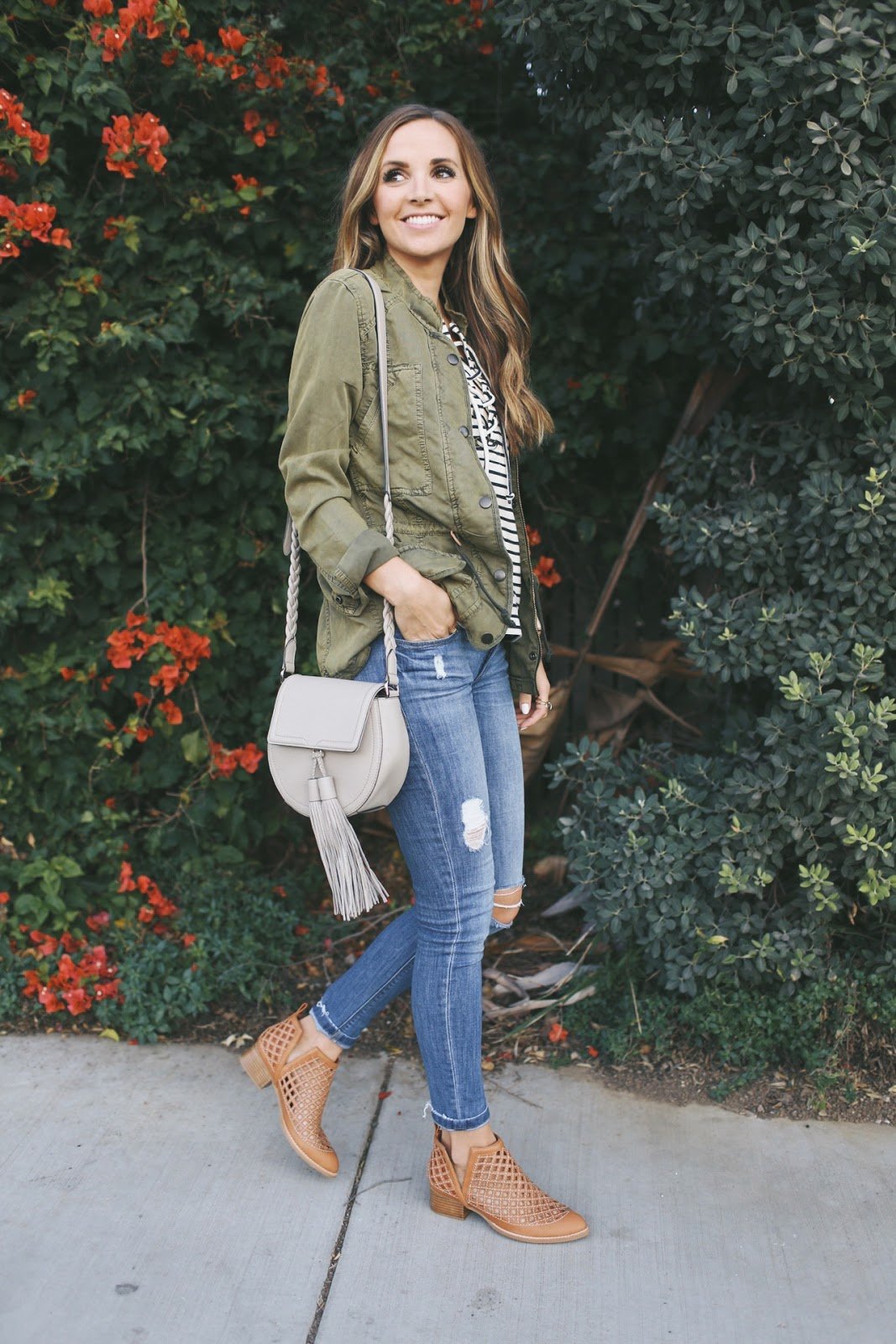 I sometimes have a hard time pinpointing my own style, but consistent thing is basics with a little twist. My ankle boots are a classic style, but the cutouts make them special and unique. I love a good striped top, and this one has a tie up neckline that makes it stand out. I love a neutral bag with a fun tassel, or a pair of jeans with just enough distressing. They’re just the little things that add personality and interest to an otherwise basic outfit!