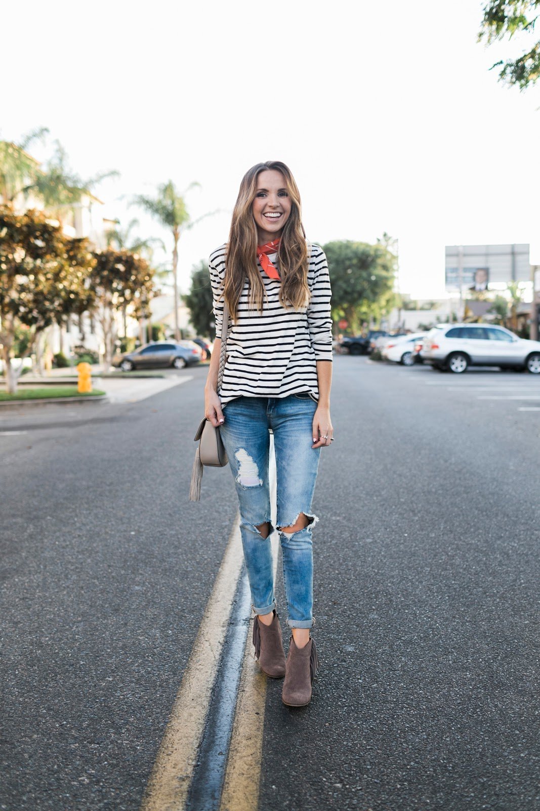 2. Try a skinny scarf. There are few different scarf options out there right now, but the ones I’m seeing the most are the skinny scarf and the square bandana scarf. The skinny scarf is a little more versatile because you can tie it in a bow around your neck, wrap it once around your neck and leave the ends hanging long, or tie those long hanging pieces in a single knot.