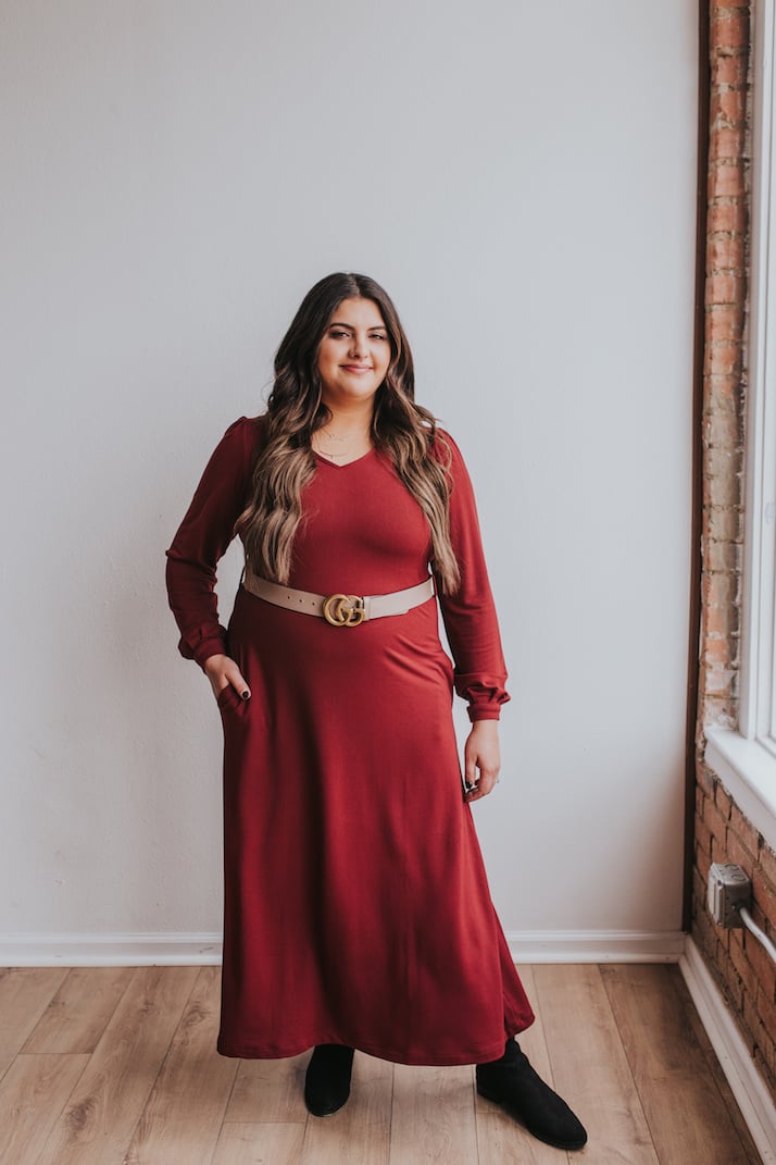MW Anywhere Long Sleeve Cranberry Dress, Gucci Belt (affordable option HERE), Black OTK Boots